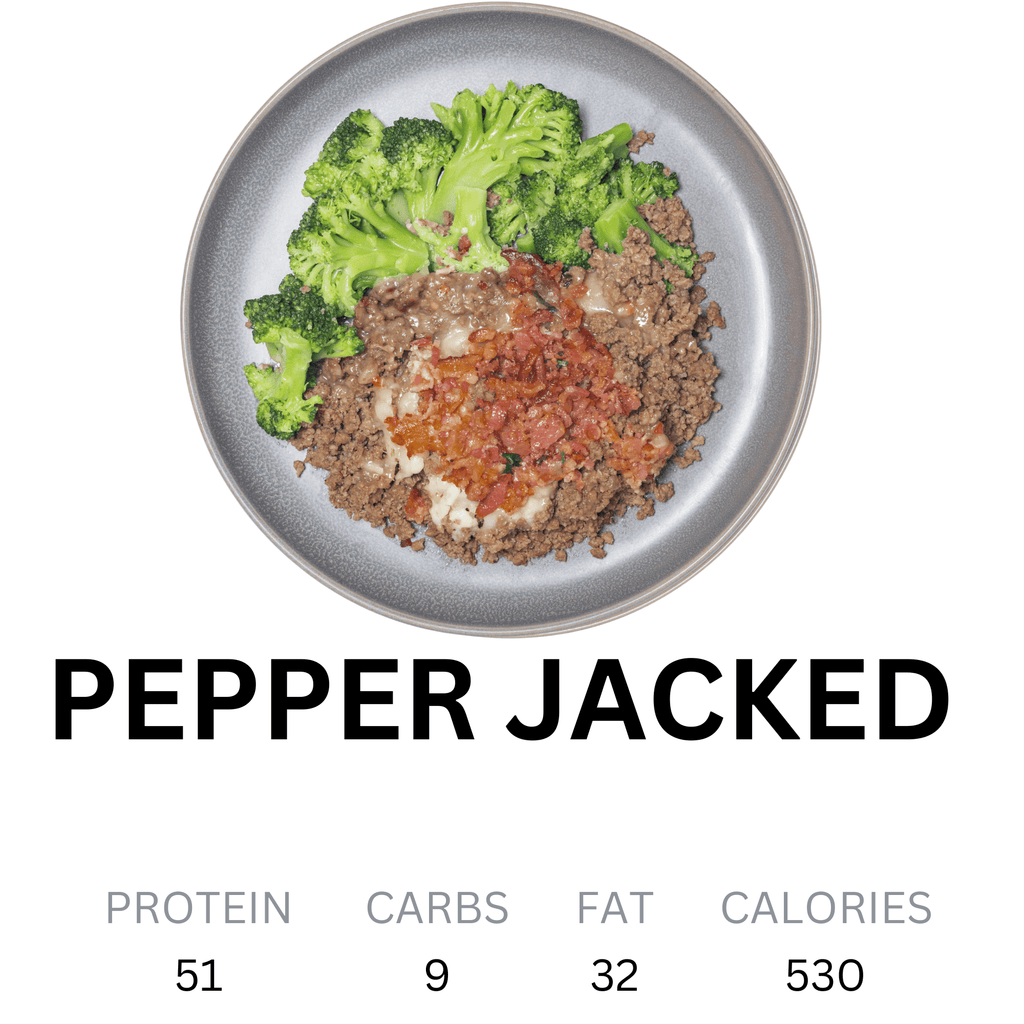 Big flavor, zero compromise. The Pepper Jacked meal brings the heat with seasoned ground beef, melty pepper jack cheese, and crispy bacon—all crafted to satisfy serious keto cravings. Paired with herb-roasted broccoli for a fresh, savory finish, this low-carb powerhouse delivers bold taste and clean fuel in every bite. High fat. High flavor. Fully Jacked.